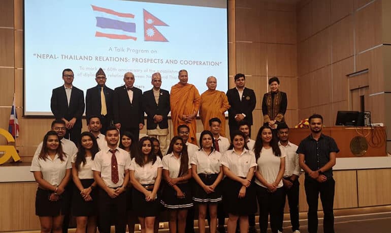 A group of final year students met with leading personalities in the Thai education sector and international representatives during an international event Nepal-Thailand Relations: Prospect and Cooperation. Associate Professor Kammal Kummar Pawa, Vice Rector for Human Resource Management at Thammasat University, Mr. Dipendra K.C., Assistant Dean for Academic Affairs at the School of Global Studies, Thammasat University, Dr.Anil Shakya, Rector of World Budhhist University, His Excellency Mr.Ganesh Prasad Dhakal, Ambassador of Nepal to the Kingdom of Thailand and His Excellency Mr.Don Pramudwinai, Minister of Foreign Affairs of the Kingdom of Thailand graced the event.